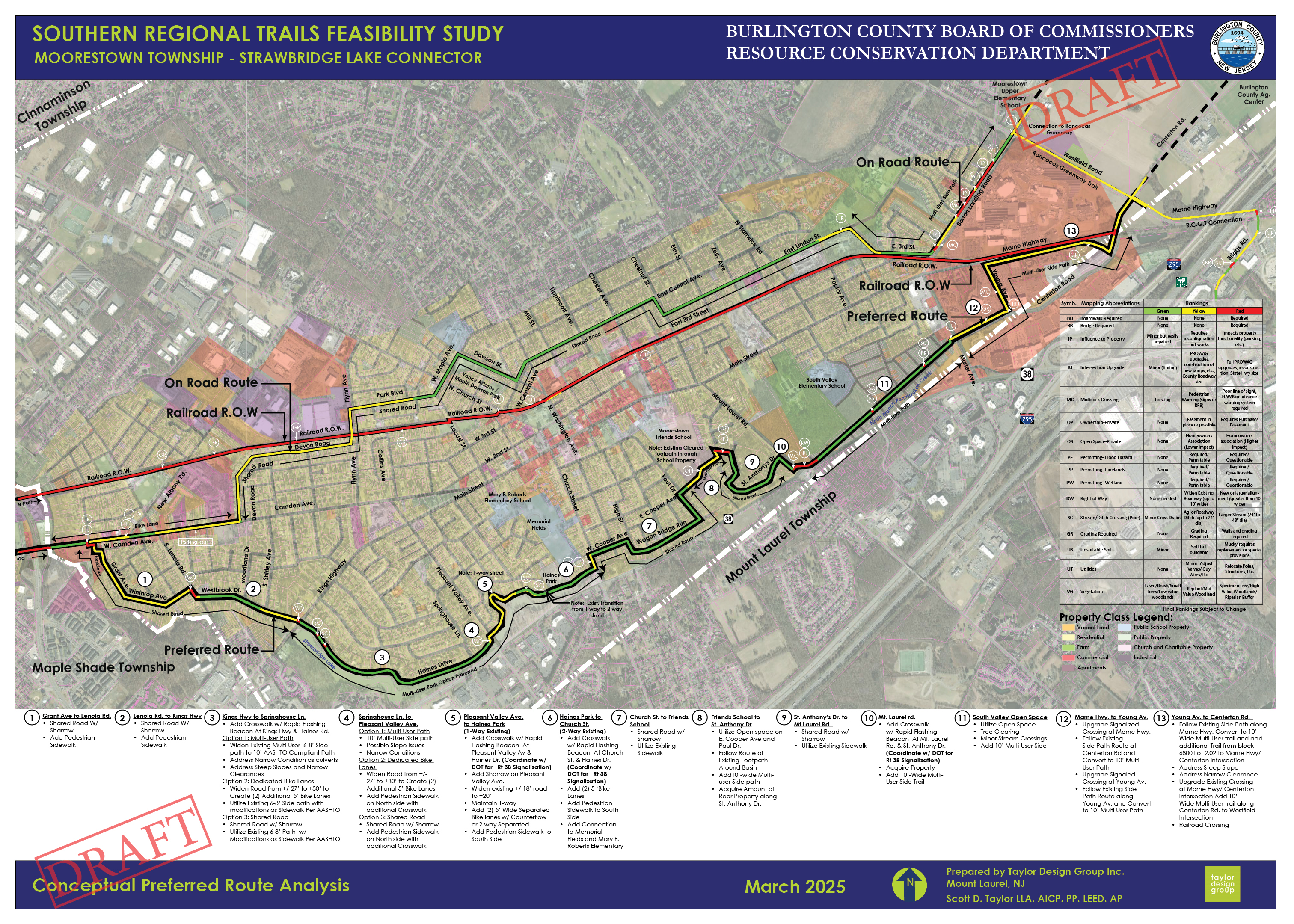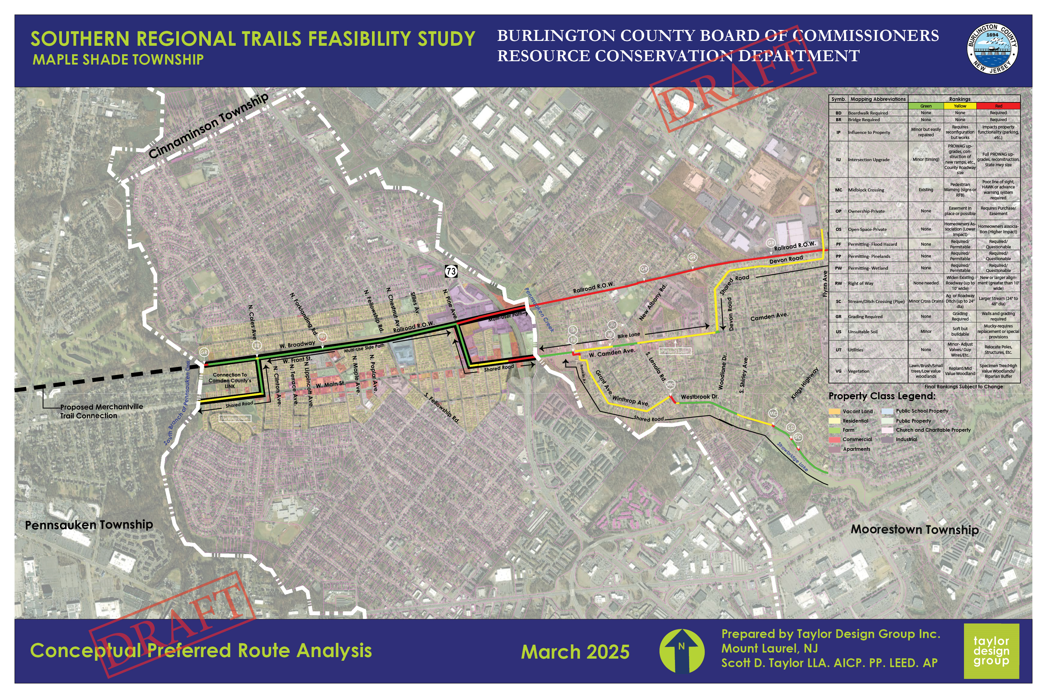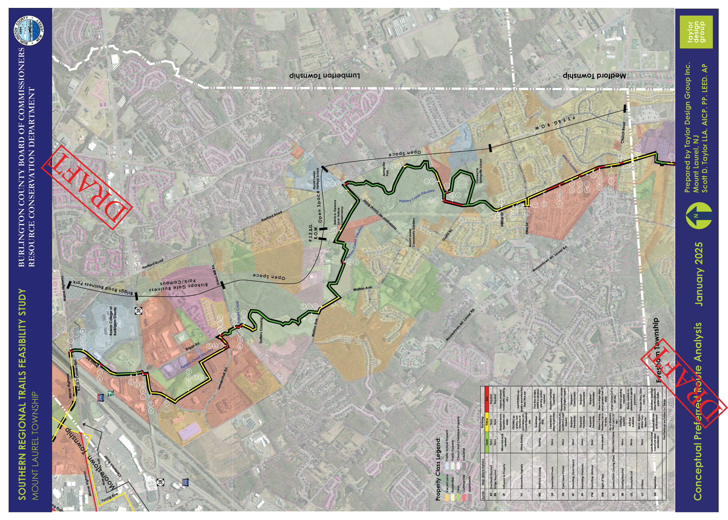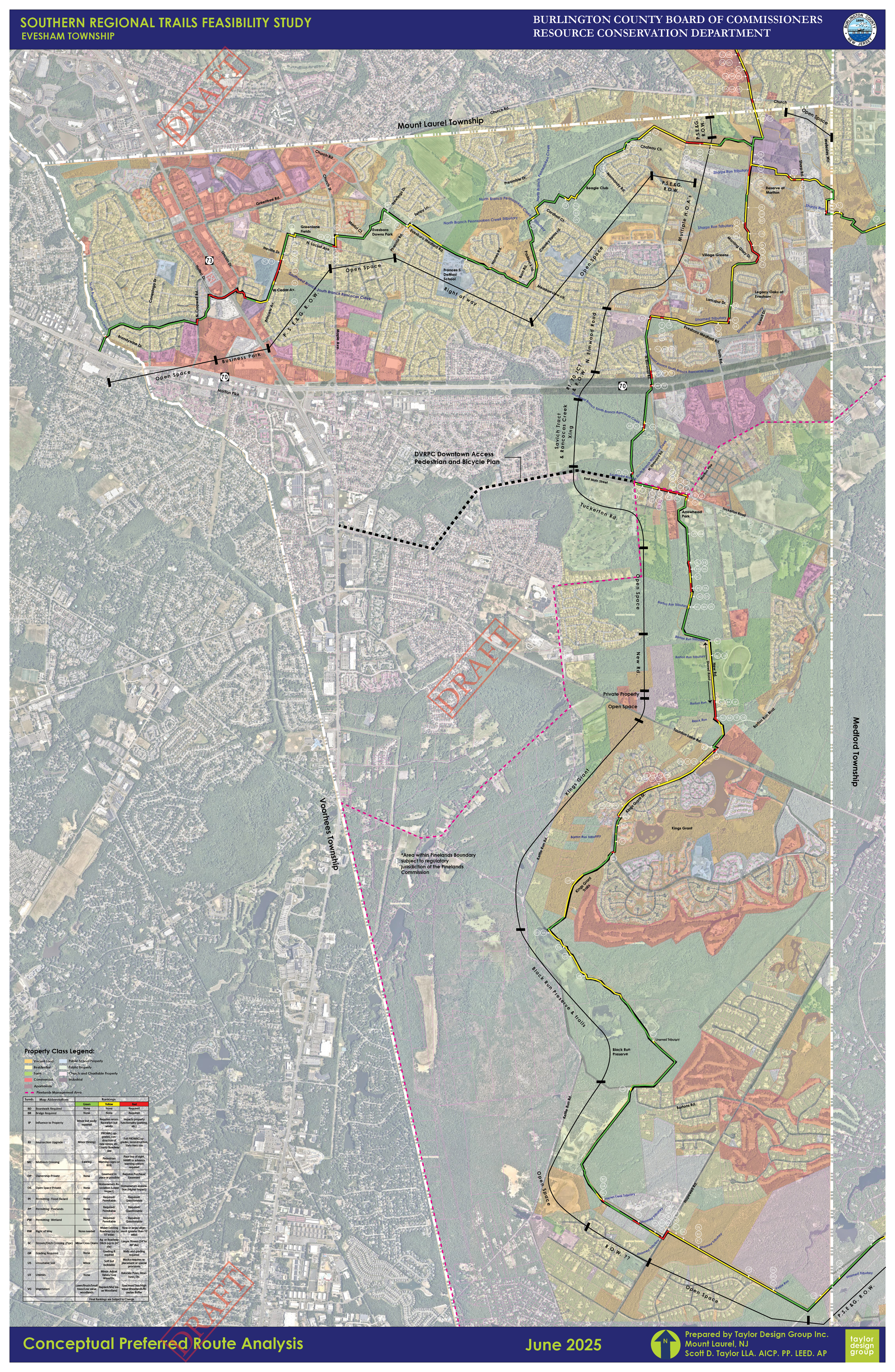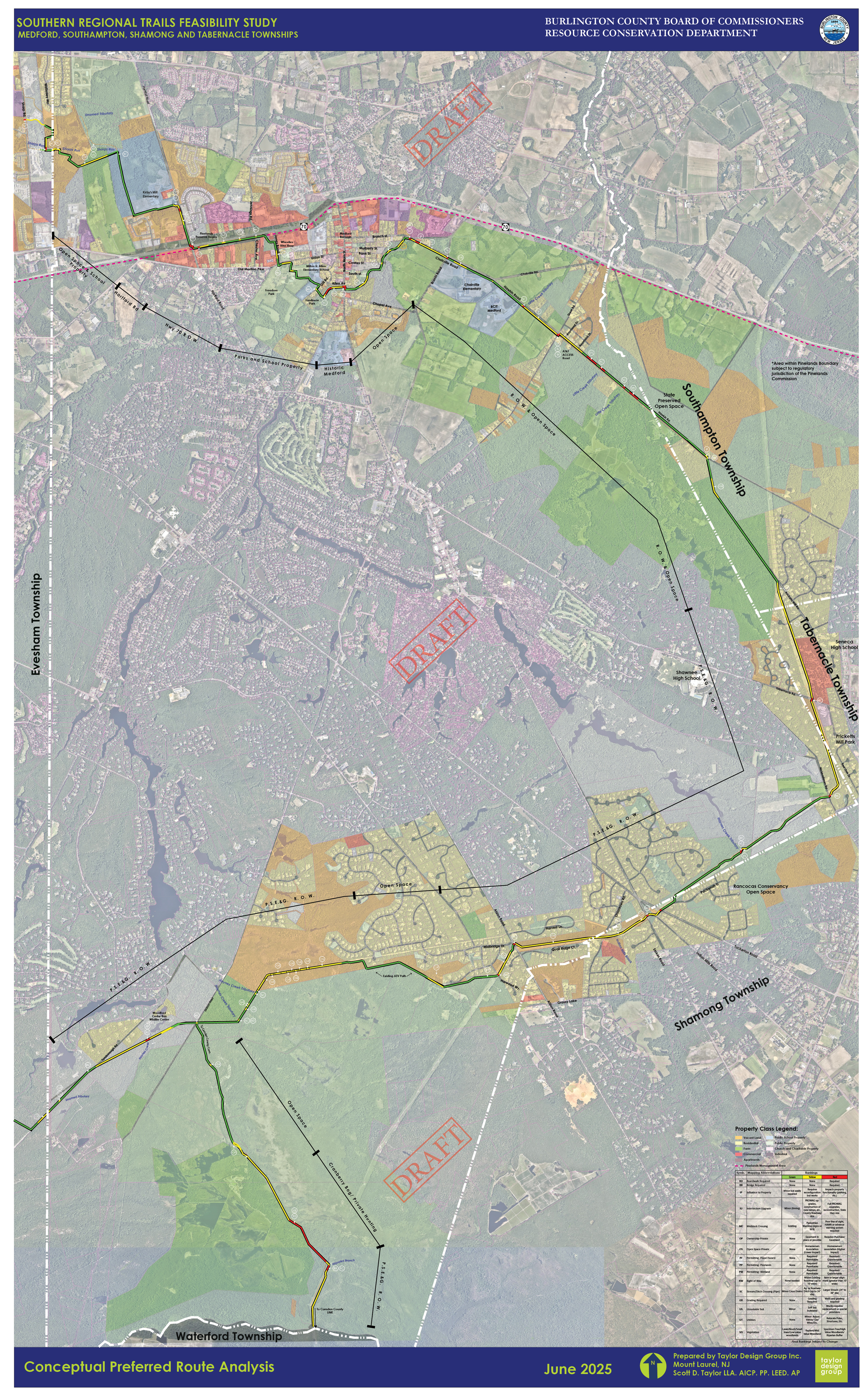 The Resource Conservation Department recently held two public information sessions to discuss the Southern Regional Trails Study. Burlington County received a Delaware Valley Regional Planning Commission, Transportation and Community Development Initiative (DVRPC, TCDI) grant to study the feasibility of constructing a roughly 50-mile regional trail connecting through portions of Maple Shade, Moorestown, Mount Laurel, Evesham, Medford, Shamong, Southampton and Tabernacle Townships, linking municipally owned open space, local schools, and more to Burlington County’s east-west Rancocas Creek Greenway. The County Board of Commissioners awarded a contract to Taylor Design Group (TDG) to investigate potential routes, including County and local rights-of-way, County and Township owned properties, etc. TDG has performed field work and identified opportunities and constraints. The public information sessions included a presentation outlining Burlington County's regional trails initiative and a review of mapping of the initially studied trail routes. Below please find copies of those materials for your perusal. If you have any comments or questions you would like to be considered before the trail route feasibility report is finalized later this year, please send an email to: trails@tdgplanning.com Thank you for your interest in Burlington County’s regional trail network!